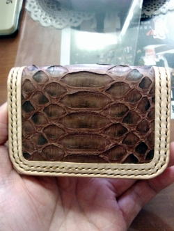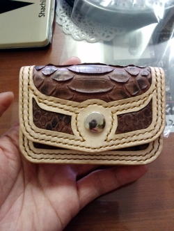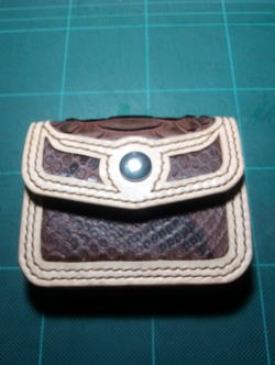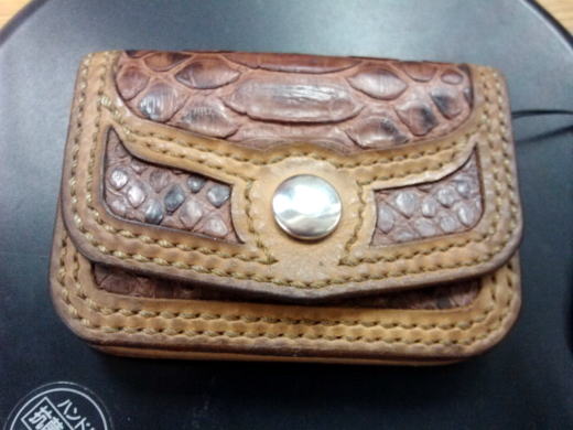 | 普段長財布は持たないが、オリジナルの小銭入れが欲しいと言う事でご依頼を受けました。 最初に出来上がった時には全体に正方形になったため、前身ごろを縮めて横長系に修正しました。 使い込むほど革の色が焦げ茶になり、糸が目だたなくなっていく様にチョイスした狙い通り、 約1年後に経過を撮らせて頂いた時にはかなり良い感じの『アジ』が出ていました。 じんさん曰く「肌身離さず持ち歩いて使ってます」との事で、とても大事に使ってくれていますね。 |