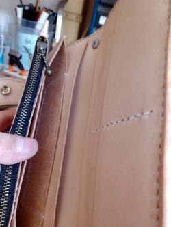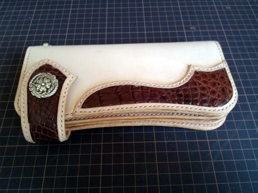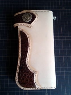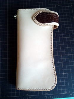 部分的にクロコダイルの革を使ったかなりシンプルなデザインですが、私が作っている2つ折湾曲型長財布の原型になっています。