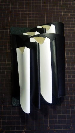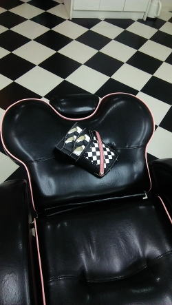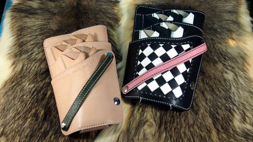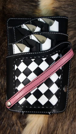 | 理容室のオーナーさんである和くんが、お店を理容室と美容室に分けて全面改装され、お店のイメージに合わせたシザーズバッグを作って欲しいとのご依頼を受け作りました。 理容室の方は1950年代をモチーフとし、白黒のチェック柄の床と黒にピンクのラインが入った特注のイスがあり、写真には写ってませんがハイカラなジュークボックスやネオン管やブロマイドなどがディスプレイされているカッコ良いお店です。 ジュークボックスから店内に流れる50’s(フィフティーズ)ソングを聴きながらノリノリで仕事するのに負けないイメージで仕上げました。 シザーズの方は8丁入れと多めで、一緒に作った陽子ちゃんのシザーズバッグより一回り大きめになっています。 |