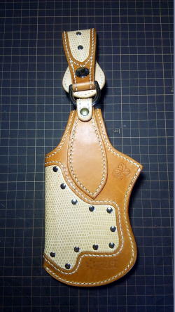 この少し前に作ったロングウォレットとおそろいの色とデザインで、ベージュ系のリザード(トカゲ)を使用しています。