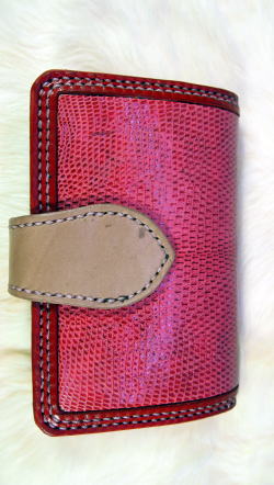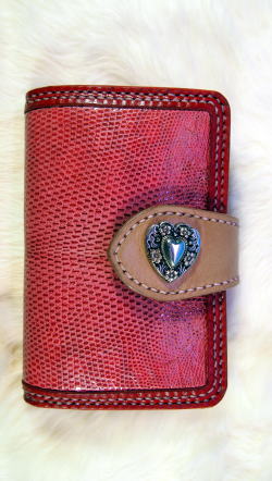 一番オーソドックスなタイプですが、ピンクのトカゲの革と糸を使い、ハートのコンチョでちょっと可愛めに作ってみました。